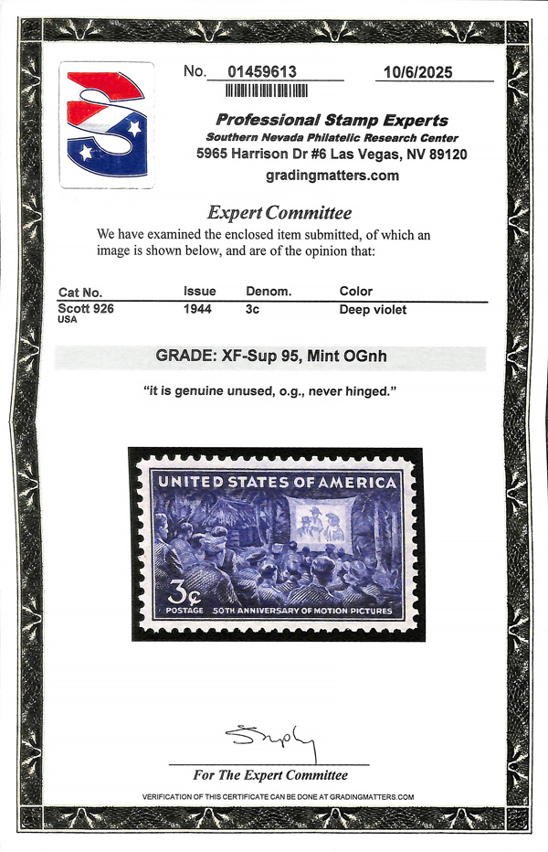 7279 nh 926 image1944, 3¢ Motion Pictures (Scott 926), o.g., never hinged, Extremely Fine to Superb, with 2025 P.S.E. certificate graded XF-SUP 95.