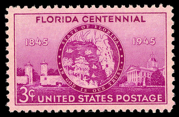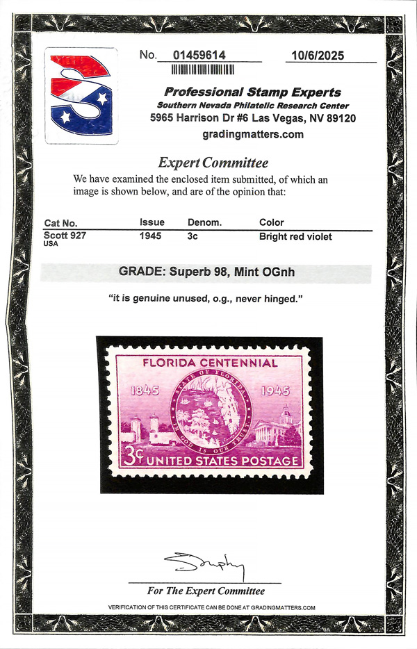 7280 nh 927 image1945, 3¢ Florida Statehood (Scott 927), o.g., never hinged, Superb, with 2025 P.S.E. certificate graded SUP 98.