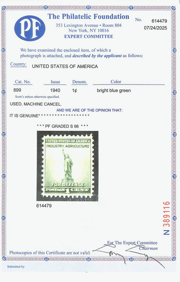 7258 O 899 image1940, 1¢ Defense (Scott 899), faint cancel, Superb, with 2025 P.S.E. certificate graded SUP 98. (Image) (Image2) (All Images)