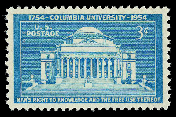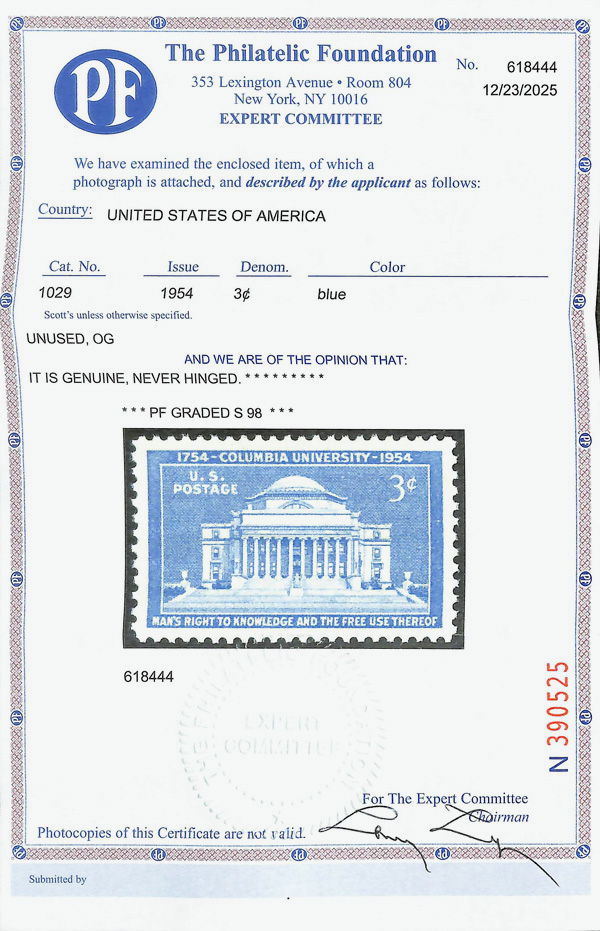 7340 nh 1029 image1954, 3¢ Columbia University (Scott 1029), o.g., never hinged, Superb, with 2025 P.F. certificate graded SUP 98.