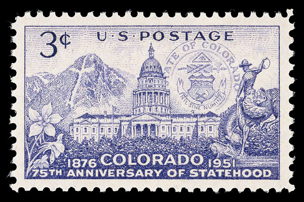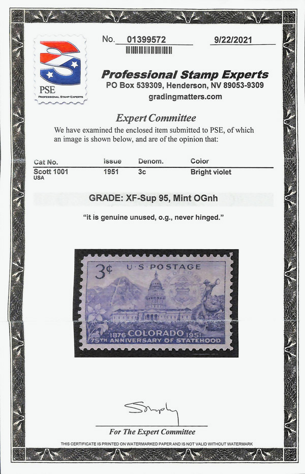 7322 nh 1001 image1951, 3¢ Colorado Statehood (Scott 1001), o.g., never hinged, Extremely Fine to Superb, with 2021 P.S.E. certificate graded XF-SUP 95.