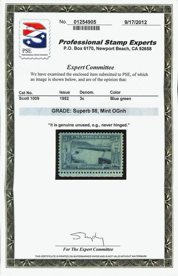 7326 nh 1009 image1952, 3¢ Grand Coulee Dam (Scott 1009), o.g., never hinged, Superb, with 2012 P.S.E. certificate graded SUP 98.