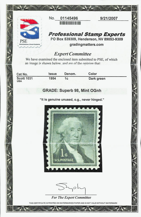 7342 nh 1031 image1954, Liberty Issue, 1¢ Washington, wet printing (Scott 1031), o.g., never hinged, Superb, with 2007 P.S.E. certificate graded SUP 98.