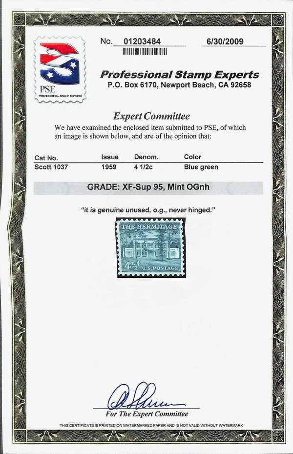 7343 nh 1037 image1959, Liberty Issue, 4½¢ Hermitage (Scott 1037), o.g., never hinged, Extremely Fine to Superb, with 2009 P.S.E. certificate graded XF-SUP 95.