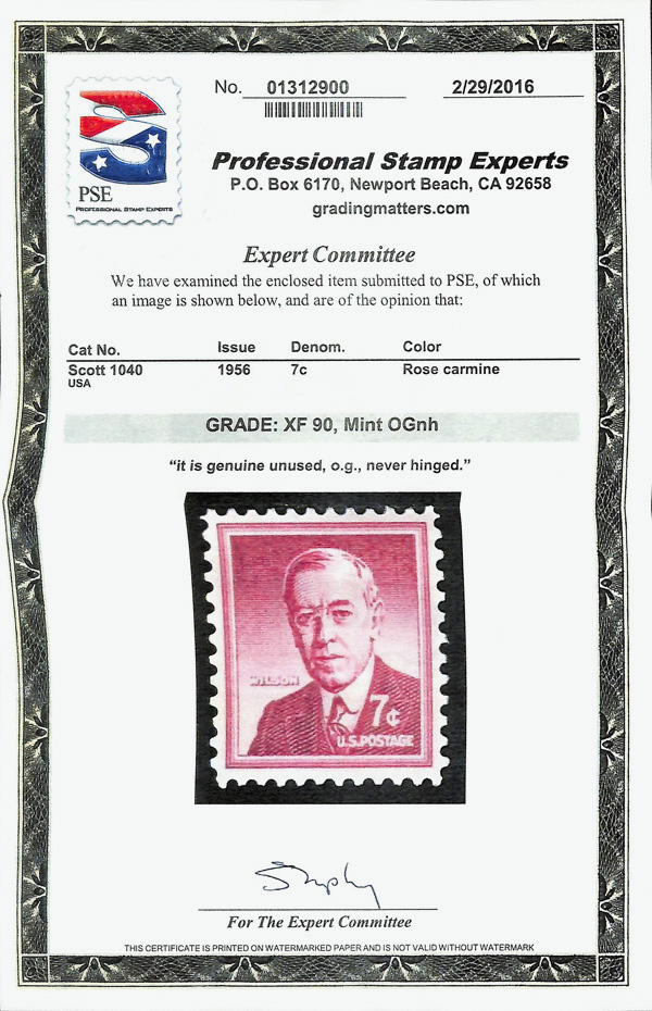 7346 nh 1040 image1956, Liberty Issue, 7¢ Wilson (Scott 1040), o.g., never hinged, Extremely Fine, with 2016 P.S.E. certificate graded XF 90.