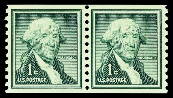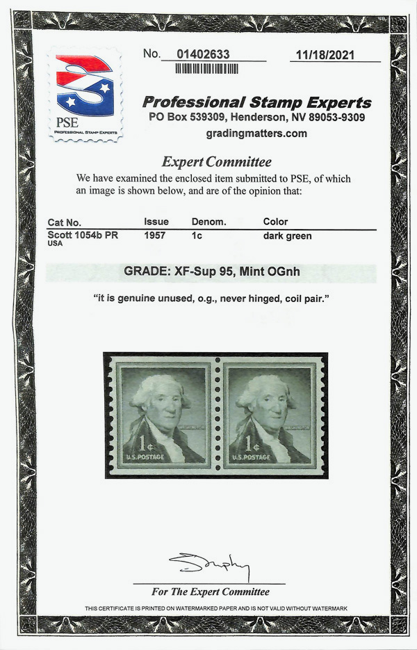 7349 nh 1054 image1954, Liberty Issue, 1¢ Washington, horizontal coil, large perf. holes, wet printing (Scott 1054), pair, o.g., never hinged, Extremely Fine to Superb, with 2021 P.S.E. certificate graded XF-SUP 95.
