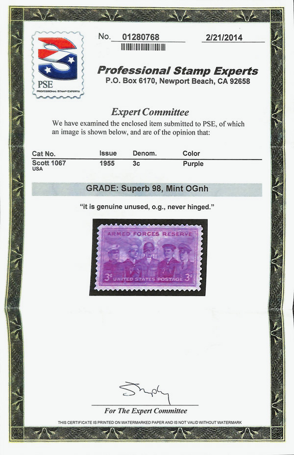 7356 nh 1067 image1955, 3¢ Armed Forces Reserve (Scott 1067), o.g., never hinged, Superb, with 2014 P.S.E. certificate graded SUP 98.