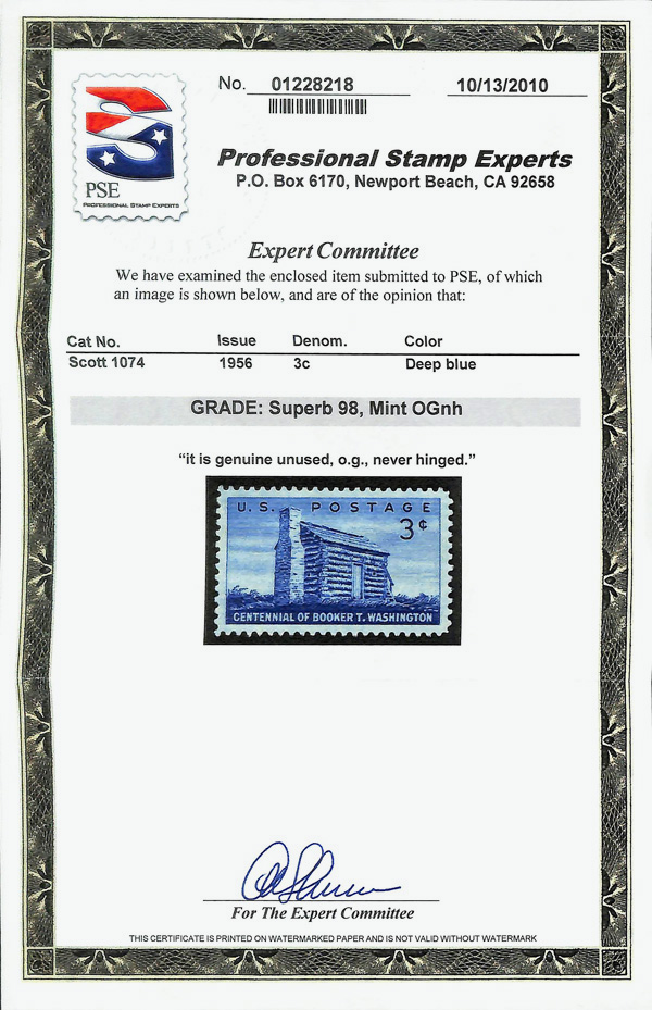 7358 nh 1074 image1956, 3¢ Booker T. Washington (Scott 1074), o.g., never hinged, Superb, with 2010 P.S.E. certificate graded SUP 98.
