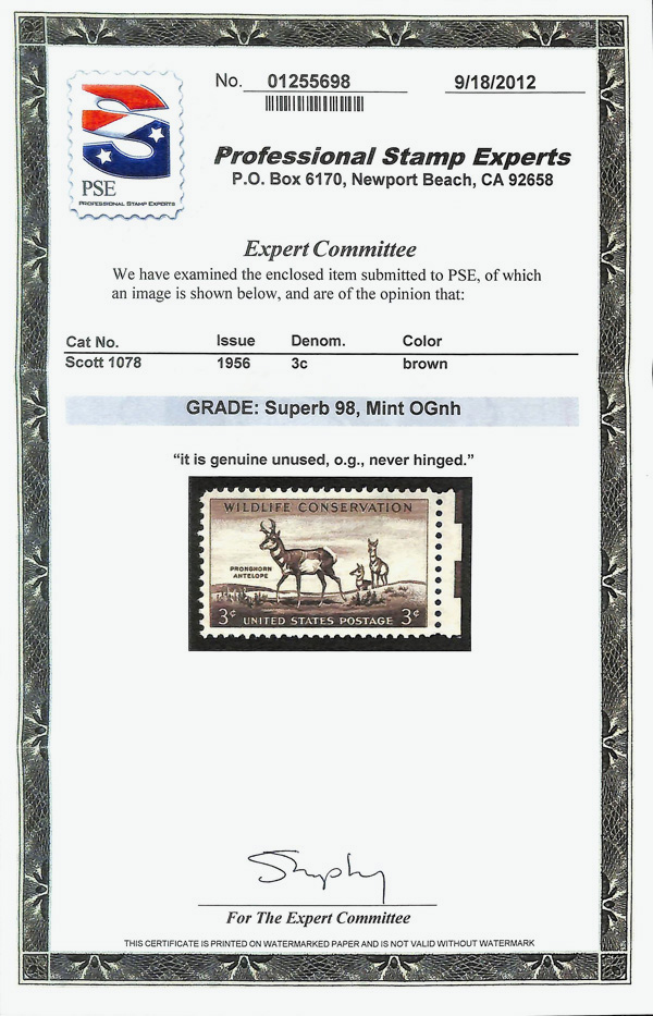 7360 nh 1078 image1956, 3¢ Wildlife Conservation: Antelope (Scott 1078), o.g., never hinged, Superb, with 2012 P.S.E. certificate graded SUP 98.