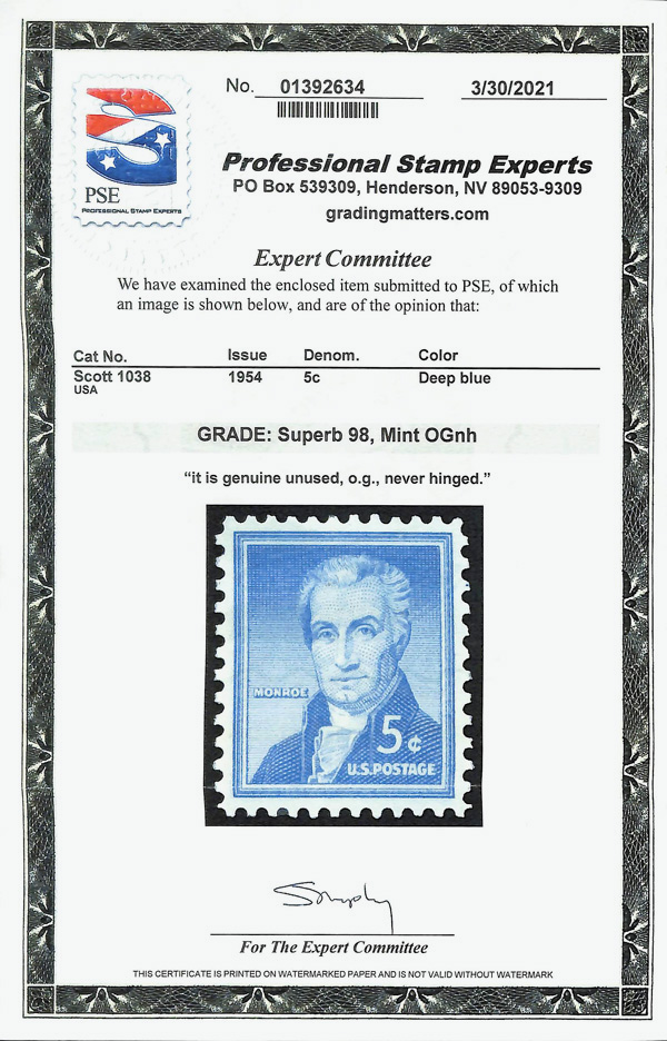 7344 nh 1038 image1954, Liberty Issue, 5¢ Monroe (Scott 1038), Fresh color presence, o.g., never hinged, Superb, with 2021 P.S.E. certificate graded SUP 98.
