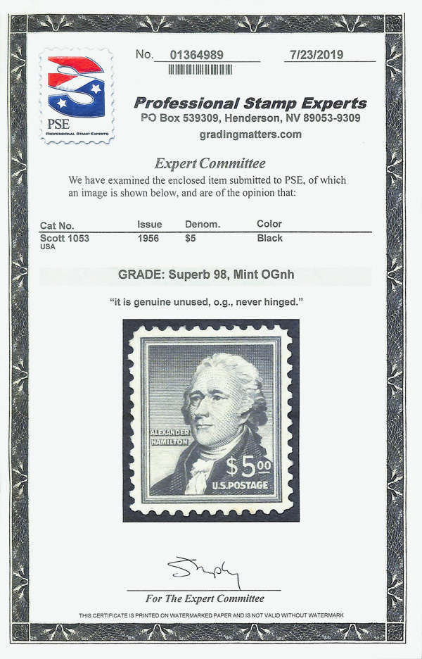 7348 nh 1053 image1956, Liberty Issue, $5 Hamilton (Scott 1053), Nicely centered design, o.g., never hinged, Superb, with 2019 P.S.E. certificate graded SUP 98.