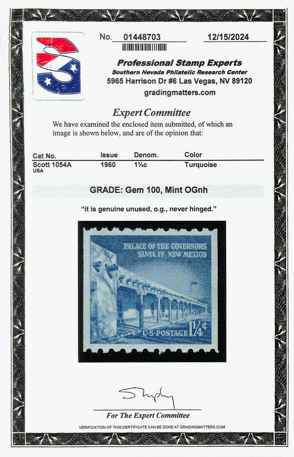 7350 nh 1054A image1960, Liberty Issue, 1¼¢ Santa Fe, vertical coil, small perf. holes (Scott 1054A), Perfectly balanced design, o.g., never hinged, Superb, with 2024 P.S.E. certificate graded GEM 100.