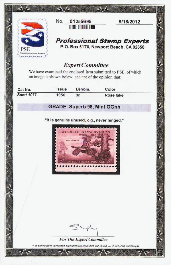 7359 nh 1077 image1956, 3¢ Wildlife Conservation: Turkey (Scott 1077), o.g., never hinged, Superb, with 2012 P.S.E. certificate graded SUP 98.