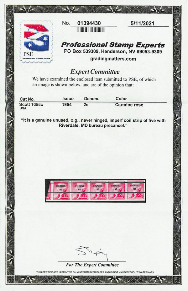 7351 nh 1055c image1954, Liberty Issue, 2¢ Jefferson, horizontal coil, untagged, imperf. pair (Scott 1055c), 'RIVERDALE/MD' precancel, o.g., never hinged, Fine to Very Fine, with 2021 P.S.E. certificate.