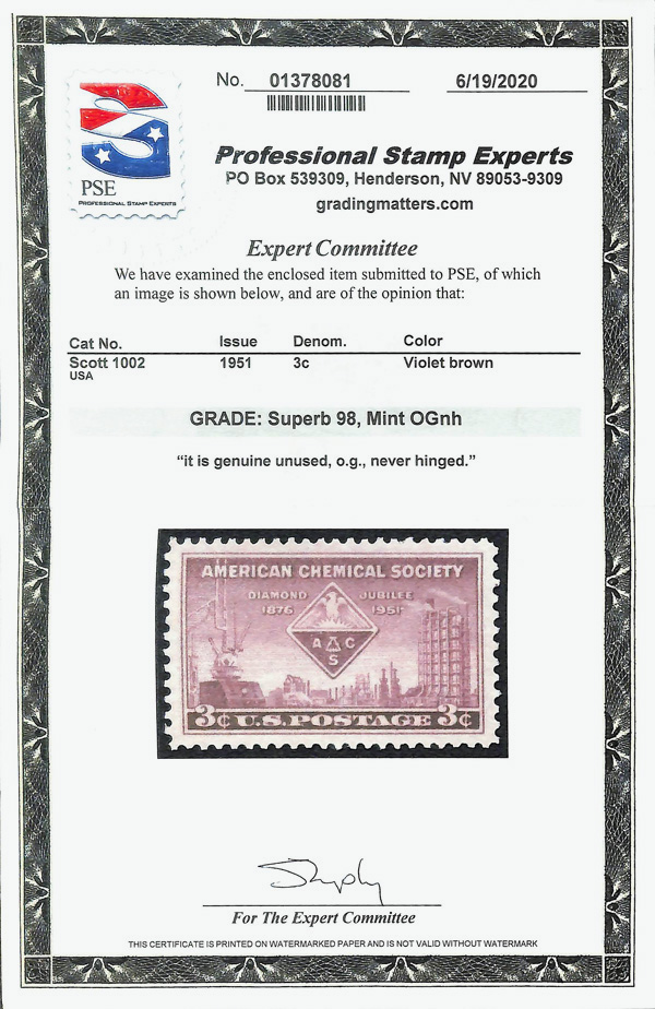 7323 nh 1002 image1951, 3¢ American Chemical Society (Scott 1002), o.g., never hinged, Superb, with 2020 P.S.E. certificate graded SUP 98.