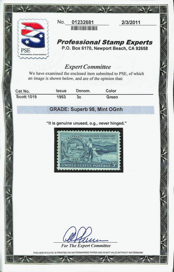 7333 nh 1019 image1953, 3¢ Washington Territory (Scott 1019), o.g., never hinged, Superb, with 2011 P.S.E. certificate graded SUP 98.