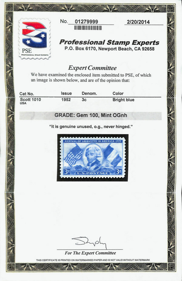 7327 nh 1010 image1952, 3¢ Lafayette (Scott 1010), o.g., never hinged, Superb, with 2014 P.S.E. certificate graded GEM 100.