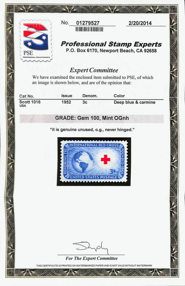 7331 nh 1016 image1952, 3¢ Red Cross (Scott 1016), o.g., never hinged, Superb, with 2025 P.S.E. certificate graded GEM 100.