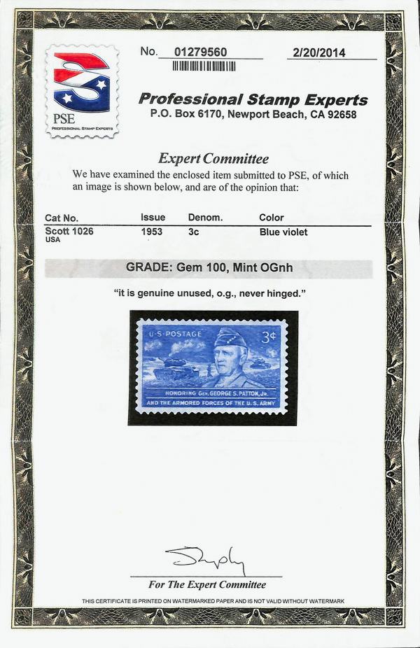 7337 nh 1026 image1953, 3¢ General Patton (Scott 1026), o.g., never hinged, Superb, with 2014 P.S.E. certificate graded GEM 100.