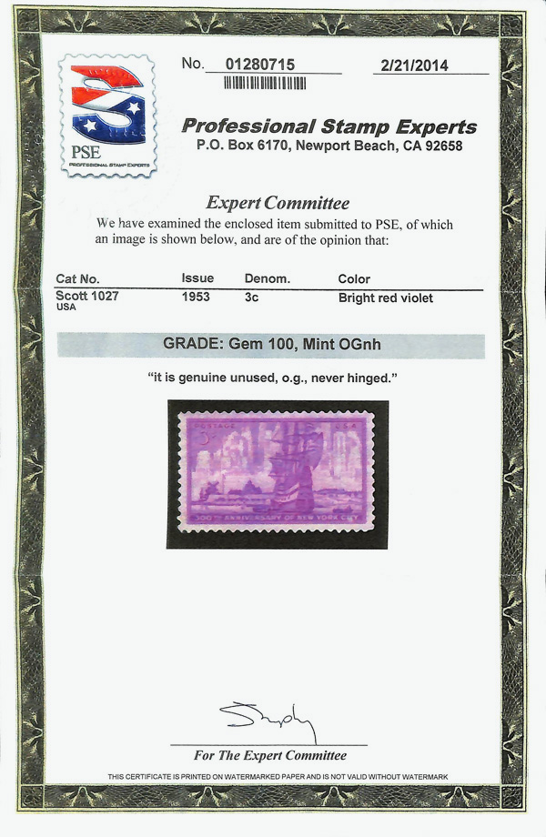 7338 nh 1027 image1953, 3¢ New York City (Scott 1027), o.g., never hinged, Superb, with 2014 P.S.E. certificate graded GEM 100.