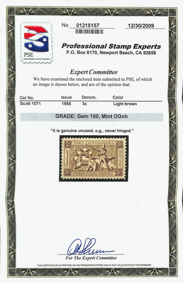 7357 nh 1071 image1955, 3¢ Fort Ticonderoga (Scott 1071), o.g., never hinged, Superb, with 2009 P.S.E. certificate graded GEM 100.