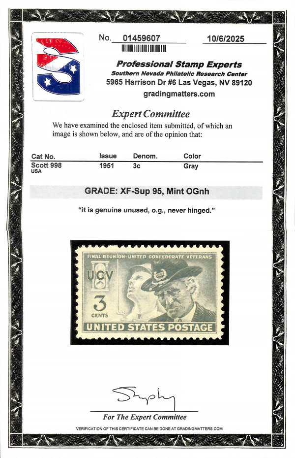 7321 nh 998 image1951, 3¢ United Confederate Veterans (Scott 998), o.g., never hinged, Extremely Fine to Superb, with 2025 P.S.E. certificate graded XF-SUP 95.