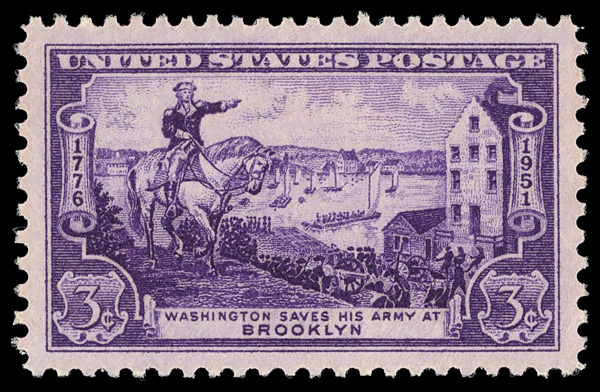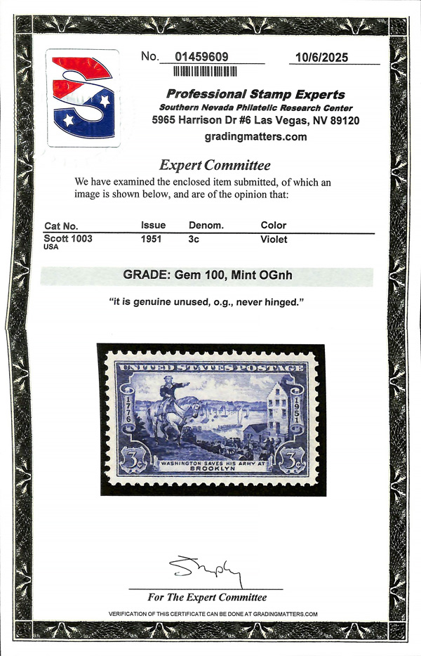 7324 nh 1003 image1951, 3¢ Battle of Brooklyn (Scott 1003), o.g., never hinged, Superb, with 2025 P.S.E. certificate graded GEM 100.