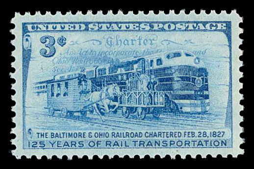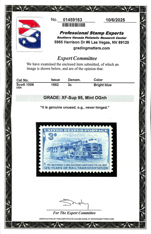 7325 nh 1006 image1952, 3¢ B. & O. Railroad (Scott 1006), o.g., never hinged, Extremely Fine to Superb, with 2025 P.S.E. certificate graded XF-SUP 95.