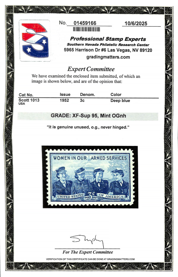 7329 nh 1013 image1952, 3¢ Women in Armed Services (Scott 1013), o.g., never hinged, Extremely Fine to Superb, with 2025 P.S.E. certificate graded XF-SUP 95.