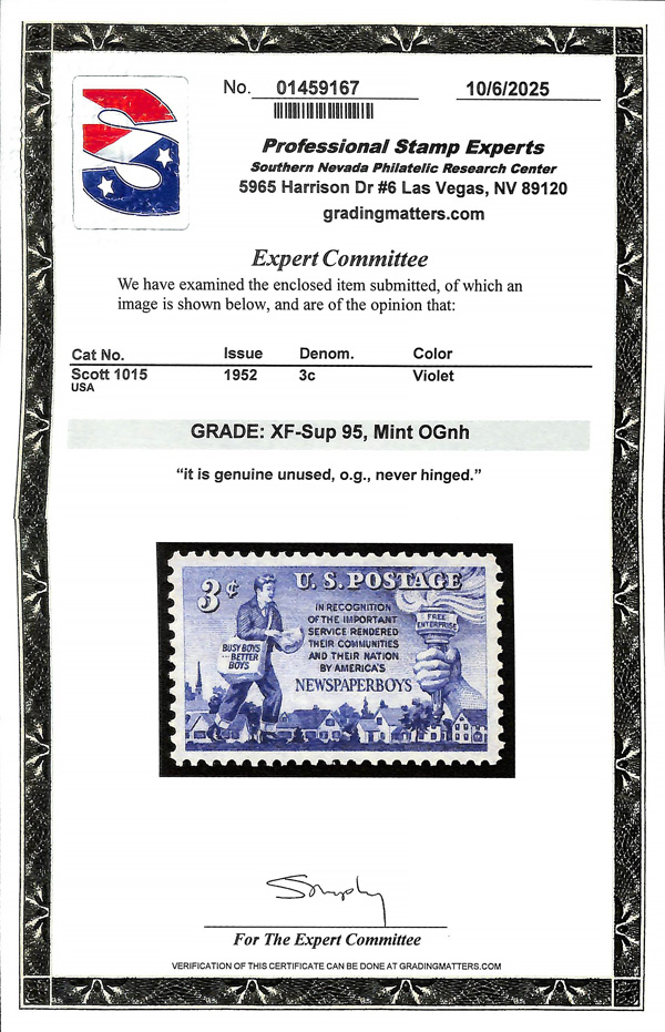 7330 nh 1015 image1952, 3¢ Newspaper Boys (Scott 1015), o.g., never hinged, Extremely Fine to Superb, with 2025 P.S.E. certificate graded XF-SUP 95.