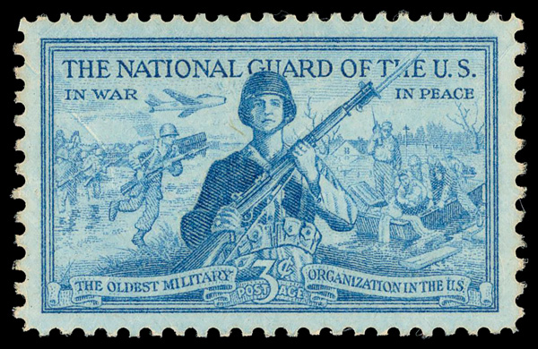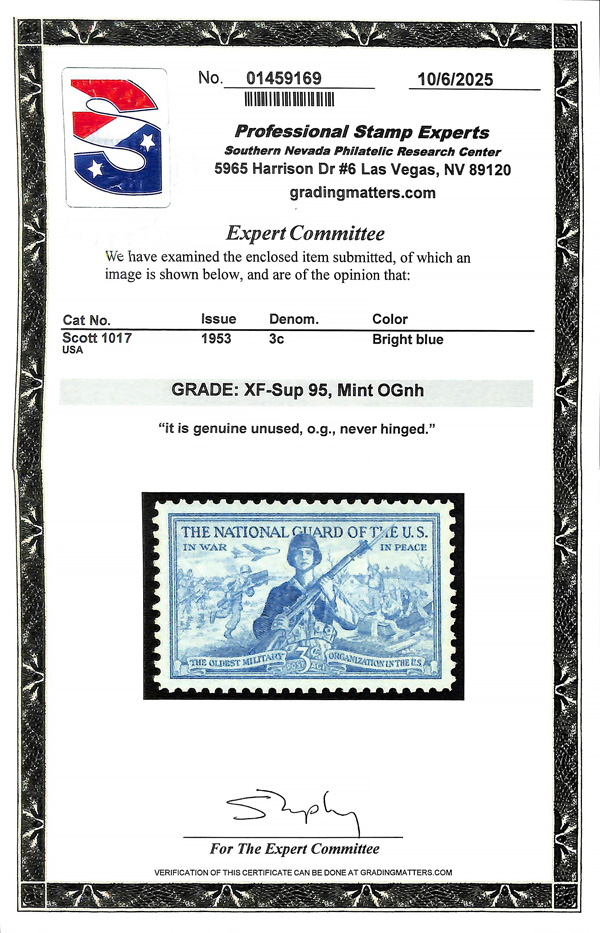 7332 nh 1017 image1953, 3¢ National Guard (Scott 1017), o.g., never hinged, Extremely Fine to Superb, with 2025 P.S.E. certificate graded XF-SUP 95.