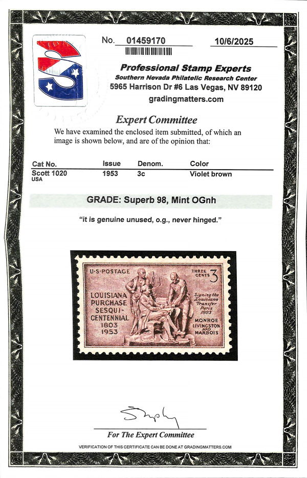 7334 nh 1020 image1953, 3¢ Louisiana Purchase (Scott 1020), o.g., never hinged, Superb, with 2025 P.S.E. certificate graded SUP 98.