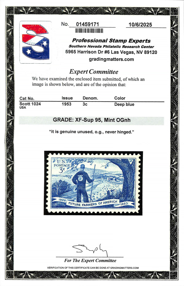 7335 nh 1024 image1953, 3¢ Future Farmers (Scott 1024), o.g., never hinged, Extremely Fine to Superb, with 2025 P.S.E. certificate graded XF-SUP 95.