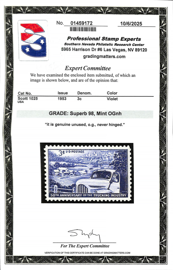 7336 nh 1025 image1953, 3¢ Trucking Industry (Scott 1025), o.g., never hinged, Superb, with 2025 P.S.E. certificate graded SUP 98.