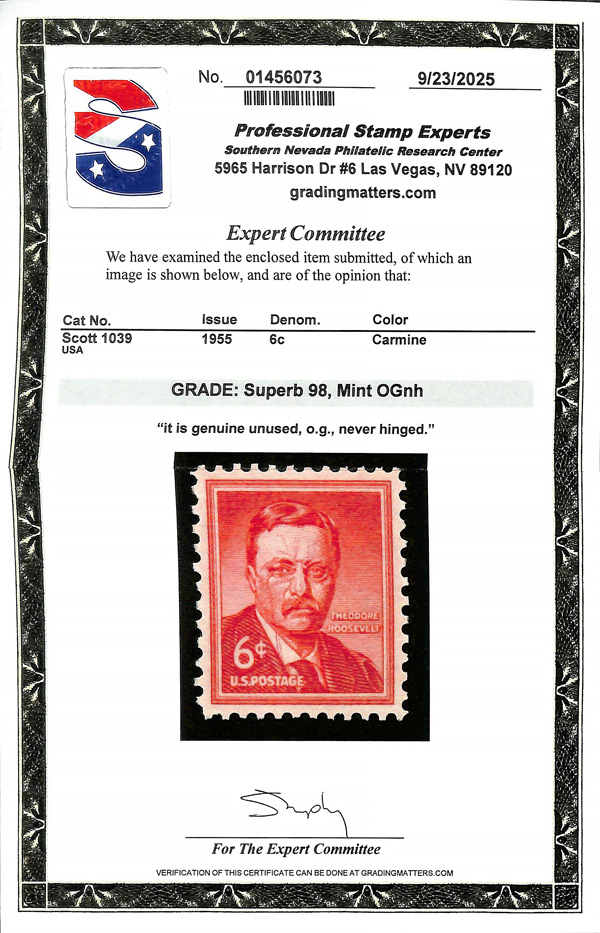 7345 nh 1039 image1955, Liberty Issue, 6¢ Theodore Roosevelt, wet printing (Scott 1039), o.g., never hinged, Superb, with 2025 P.S.E. certificate graded SUP 98.