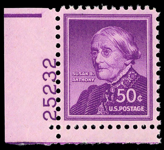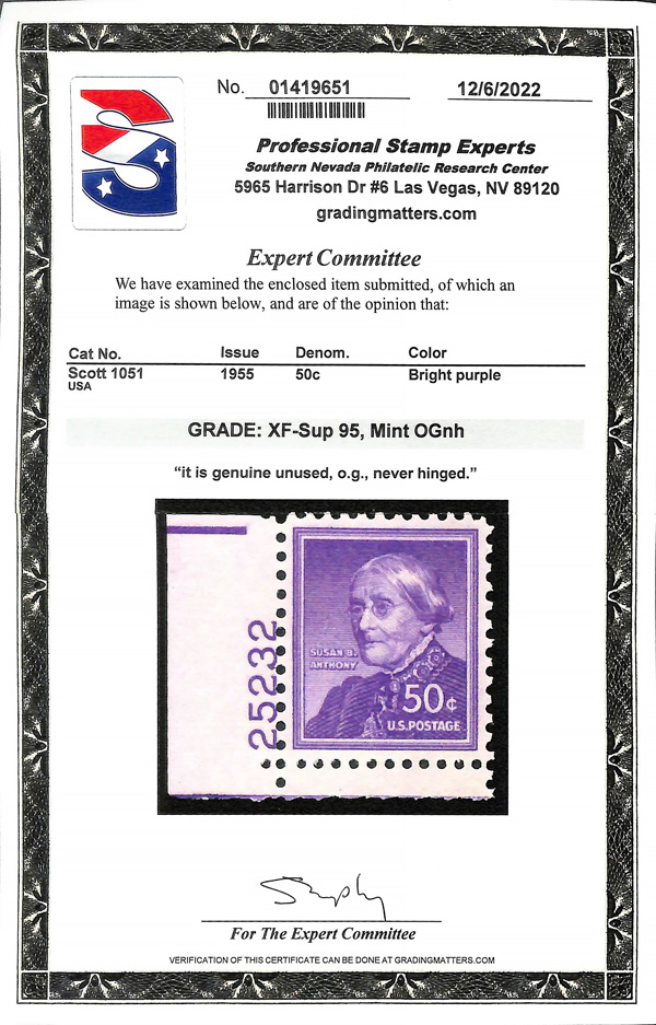 7347 nh 1051 image1955, Liberty Issue, 50¢ Susan B. Anthony, wet printing (Scott 1051), plate number single, o.g., never hinged, Extremely Fine to Superb, with 2022 P.S.E. certificate graded XF-SUP 95.