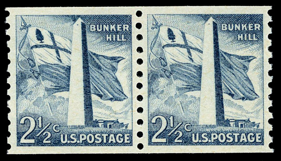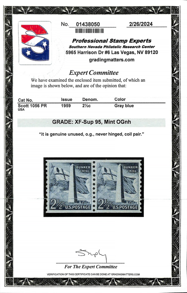 7352 nh 1056 image1959, Liberty Issue, 2½¢ Bunker Hill, horizontal coil, large perf. holes (Scott 1056), pair, o.g., never hinged, Extremely Fine to Superb, with 2024 P.S.E. certificate graded XF-SUP 95.