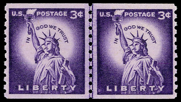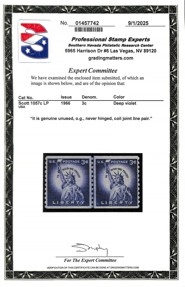 7353 nh 1057c image1966, Liberty Issue, 3¢ Statue of Liberty, horizontal coil, tagged, Look magazine printing (Scott 1057c), joint line pair, o.g., never hinged, Very Fine, with 2025 P.S.E. certificate.