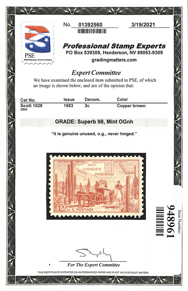 7339 nh 1028 image1953, 3¢ Gadsden Purchase (Scott 1028), o.g., never hinged, Superb, with 2021 P.S.E. certificate graded SUP 98.