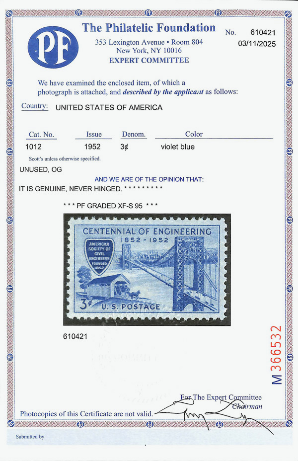 7328 nh 1012 image1952, 3¢ Engineering Centennial (Scott 1012), o.g., never hinged, Extremely Fine to Superb, with 2025 P.F. certificate graded XF-SUP 95.