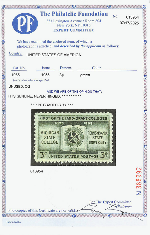 7355 og 1065 image1955, 3¢ Land Grant Colleges (Scott 1065), certificate notes NH in error, o.g., lightly hinged, Superb, with 2025 P.F. certificate graded SUP 98.