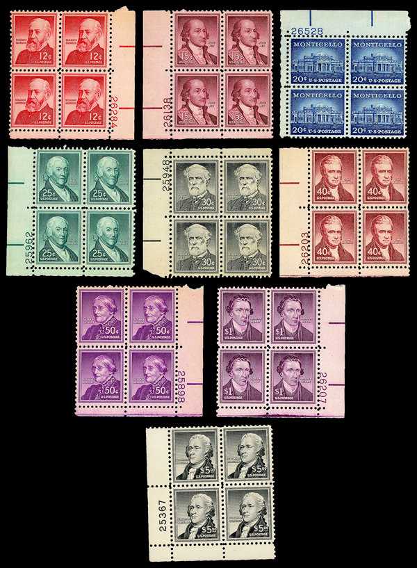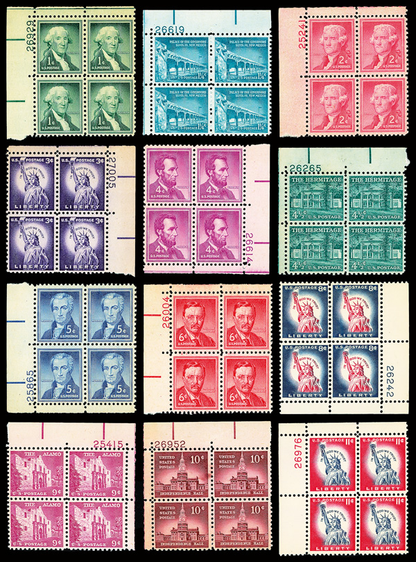 7341 nhbl 1031//1053 image1954, 1¢//$5 Liberty Issue (Scott 1031//1053), plate blocks of 4, complete less #1030, 1032, 1034 and 1041-1041B, with a mix of wet and dry printings; all sound and bright with attractive centering, o.g., never hinged, Fine to Very Fine or better.