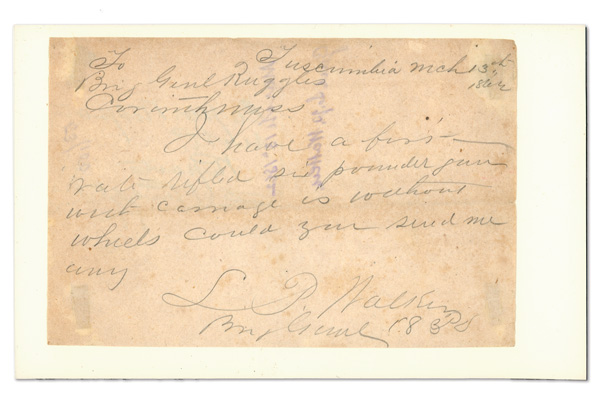 in bold and well preserved pencil in clerical hand, datelined "Tuscumbia (Ala.), Mch. 13th, 1862, To Brig. Gen. (Daniel) Ruggles, Corinth, Miss. and reads, "I have a first-rate rifled six pounder gun with carriage - is without wheels. Could you