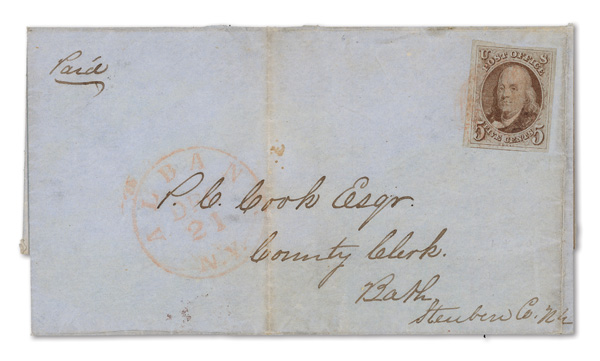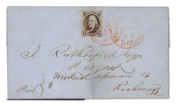 send me any." reverse with docketing in blue and violet crayon-pencil and 4 old paper hinge strips where apparently mounted in a Confederate letter-book of received messages, this numbered "53/100.", ex Lee Maxfield Collection (Cohasco auction
