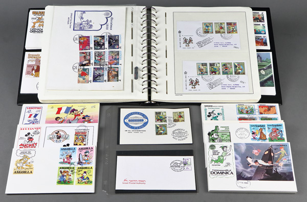 Covers celebrating Walt Disney the world over; sets include 45 envelopes in the binder (as well as mint and used blocks of stamps), and an additional 90 with attractive cachets and unaddressed; countries include Lesotho, Sierra Leone, Commonweath of