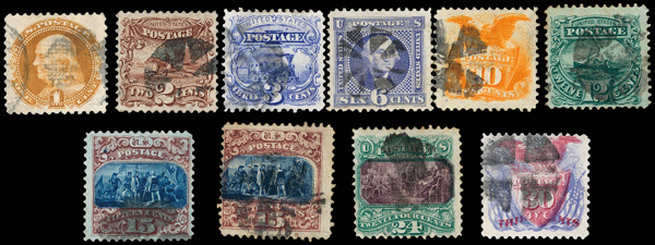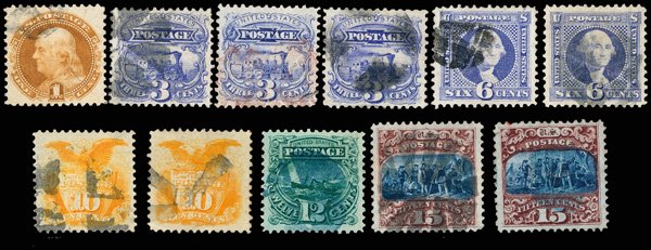 1869, 1¢//15¢ used selection (Scott 112//119), 11 stamps in total, neatly arranged on a black card, comprising