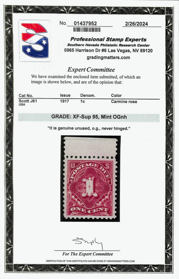 Postage Due, 1917, 1¢ carmine rose, unwatermarked, perf. 11 (Scott J61), o.g., never hinged, Extremely Fine to