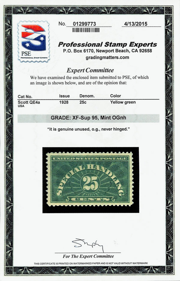 5451 nh QE4a imageSpecial Handling, 1928, 25¢ yellow green (Scott QE4a), Fresh look throughout, o.g., never hinged, Extremely Fine to Superb, with 2015 P.S.E. certificate graded XF-SUP 95.