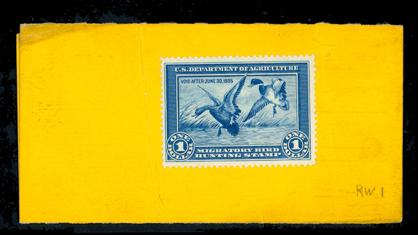 5478 ng RW1 imageFederal Duck Stamp, 1934, $1 Mallards (Scott RW1), unsigned example on a Maine hunting permit, unused without gum, Very Fine.