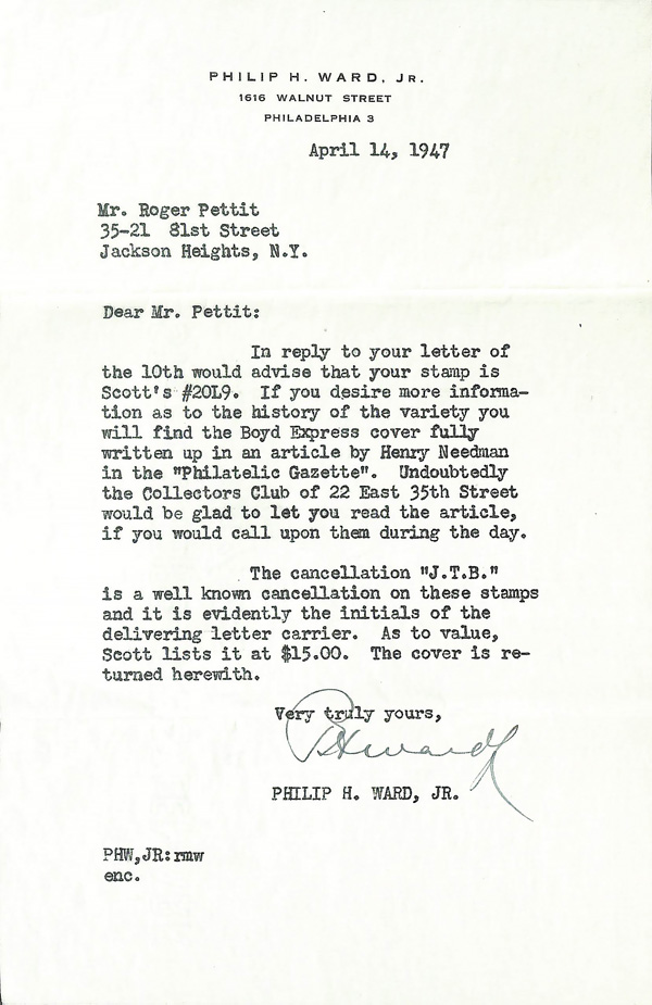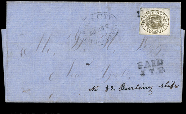 5454 cover 20L9 imageBoyd's City Express, 1852, 2¢ gold (Scott 20L9), tied to cover by 'PAID/J.T.B.' handstamp and separate 'BOYD'S CITY EXPRESS POST' cancel. Accompanied by 1947 authentication letter from prominent dealer Philip Ward., Very Fine to Extremely Fine.